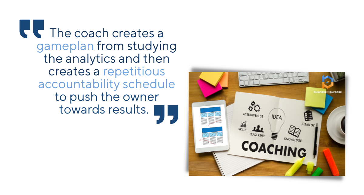 A business coach’s role (much like an athletic coach’s role) is to constantly research and study the “game” of business, work to develop playbooks, roadmaps, and techniques that each business owner and key leader (players) can follow, and then show up enthusiastically and repetitiously on a predetermined schedule to create the necessary push and conditioning through accountability and implementation.