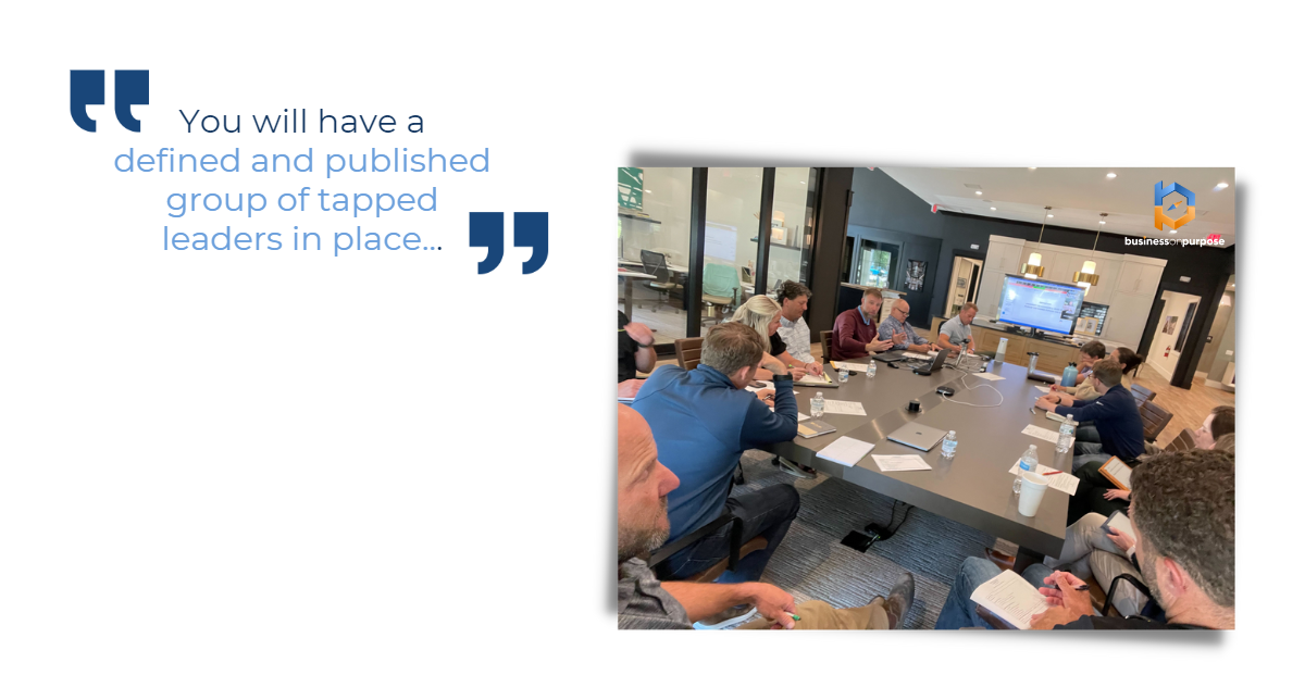 Second, you will have a defined and published group of tapped leaders in place, and those leaders will begin showing evidence of building and refining the team to carry the heavy loads of business.