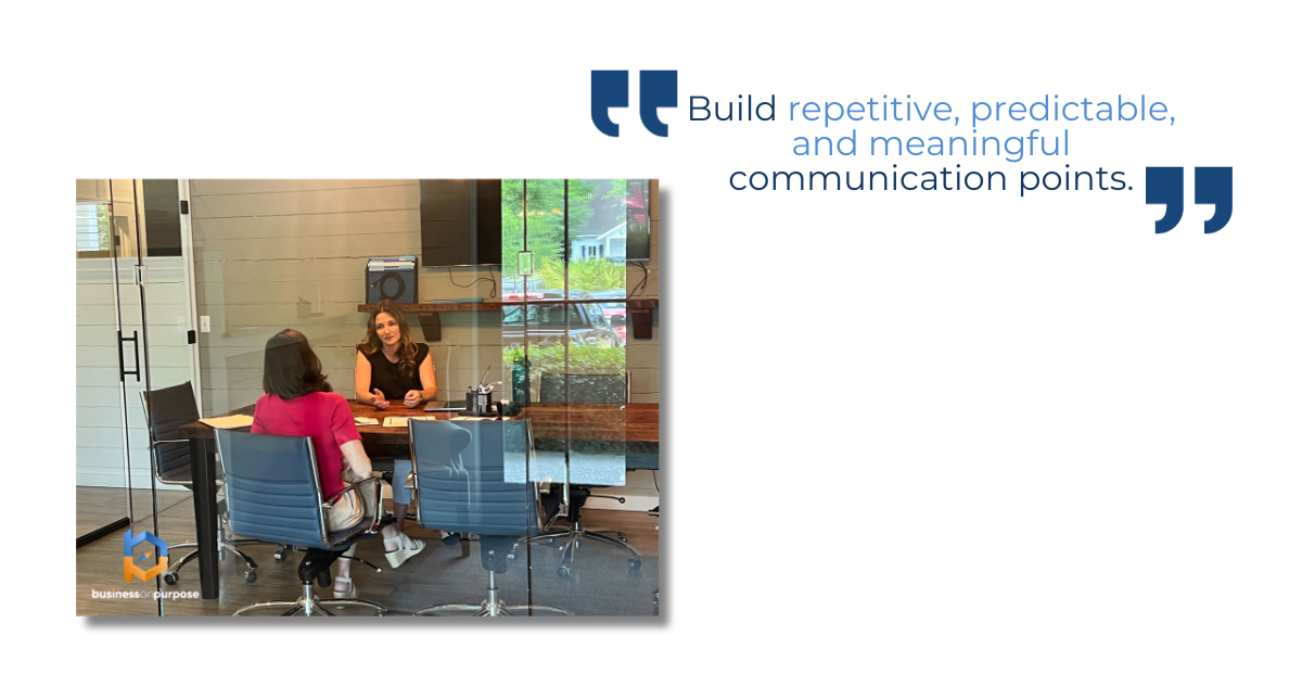 Each person who has been delegated to must have time on their leader’s calendar that is pre-set and has a pre-determined set of questions that are aligned to the role, scorecard, and culture of what is being asked.