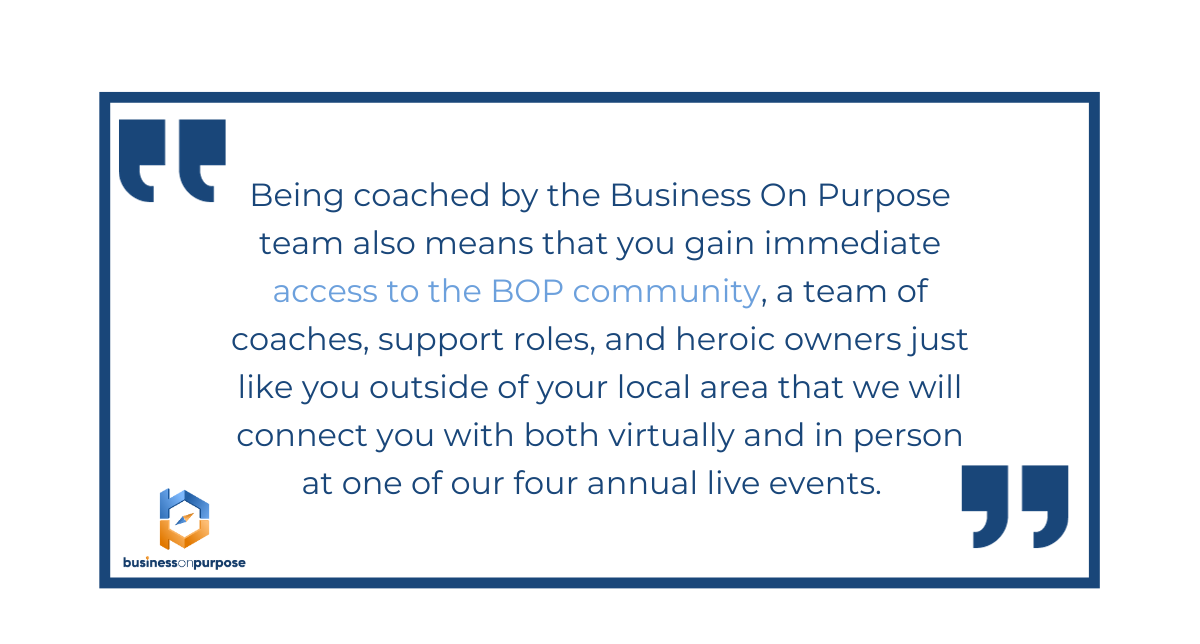 Being coached by the Business On Purpose team also means that you gain immediate access to the BOP community, a team of coaches, support roles, and heroic owners just like you outside of your local area that we will connect you with both virtually and in person at one of our four annual live events.