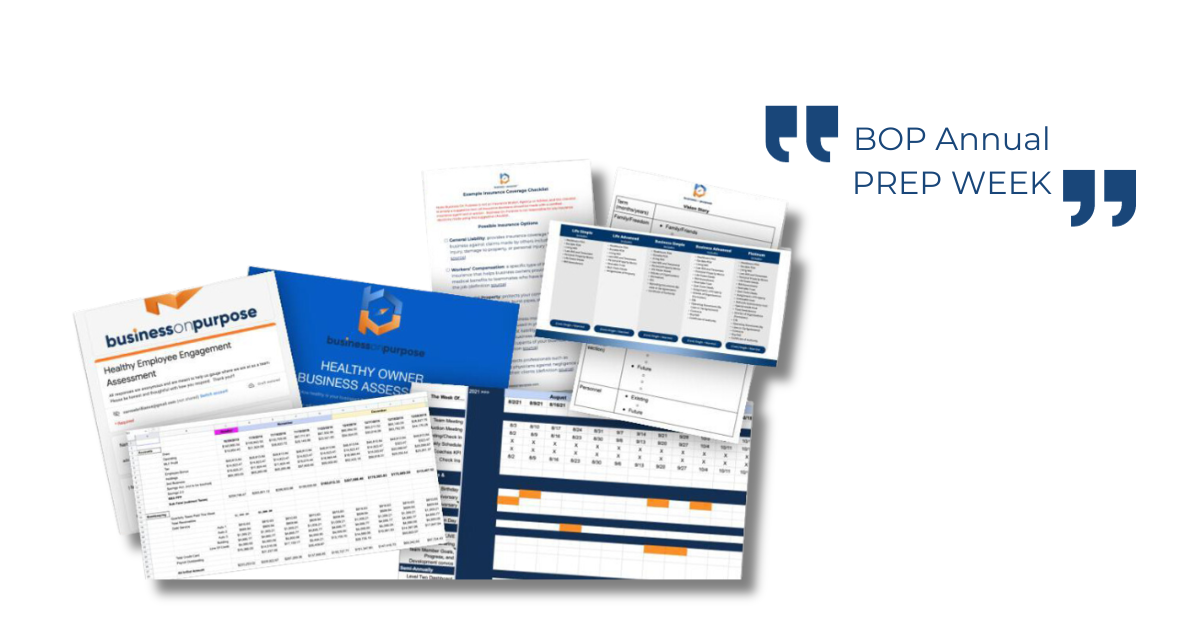 Each year in November, your coach will get you set and ready for the anticipated BOP Annual PREP WEEK. Over three additional coaching sessions, you will join the entire BOP client community of owners to focus on three areas of preparation for the upcoming year: your business purpose and culture, your business finance and budgeting, and your personal life planning around estate planning and personal budgeting.