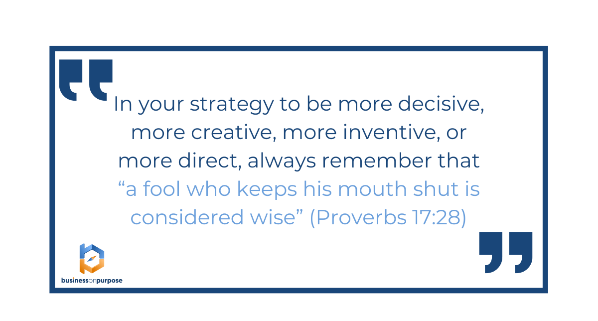 In your strategy to be more decisive, more creative, more inventive, or more direct, always remember that “a fool who keeps his mouth shut is considered wise” (Proverbs 17:28).