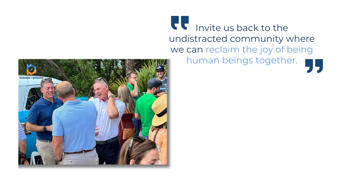 GOAL: This time together is a time to gently and clearly compel and invite us back to the undistracted community where we can reclaim the joy of being human beings together (husbands, wives, friends, children, cousins, and co-workers). An invitation to notice human inflections, to see human hurt, to feel human joy.