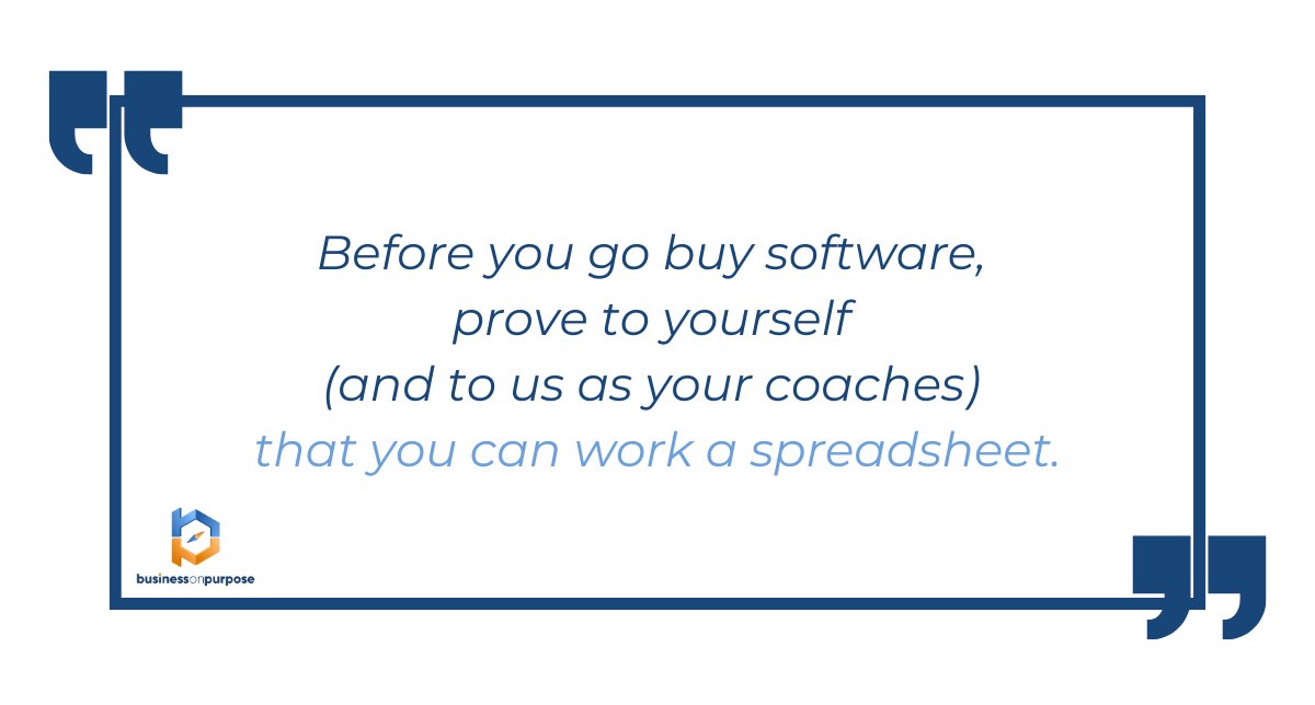 Simple tools like spreadsheets and calendars can be more powerful than expensive software—at least until you’ve proven you can manage the basics. We often say, “Before you go buy software, prove to yourself (and to us as your coaches) that you can work a spreadsheet.”